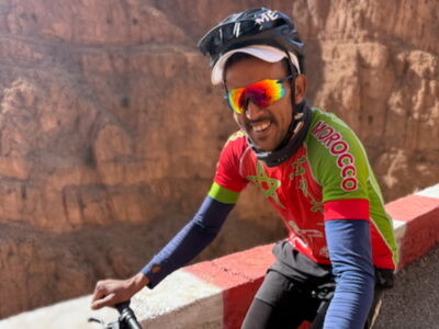 Wanneer je je inschrijft voor een gravelreis in Marokko, is Hicham jouw gids ter plaatse. Hij fietst met je mee, ondersteunt in de keuken, regelt de logistiek en fungeert als technische alleskunner. Daarnaast is hij een uitzonderlijk sterke fietser én hardloper. Zijn roots liggen in de Atlas Mountains, waar hij opgroeide in de prachtige Vallée Heureuse op 2000 meter hoogte. Hij heeft een PR van 2.28 op de marathon. Zijn laatste wapenfeit is het winnen van de Trail Desert Agafay — het combi-evenement van 83 kilometer (60 km bike + 23 km trail). Tijdens de reizen is de verzorging onder zijn hoede altijd dik in orde. Het is mooi om te zien hoe hij en zijn team voortdurend aandacht hebben voor de mensen om hen heen: kinderen krijgen altijd iets mee, en een zwerver of willekeurige passant schuift zonder aarzeling aan bij de maaltijd. Zorgzaamheid zit diep in zijn DNA — en is typisch voor zoveel Marokkanen.